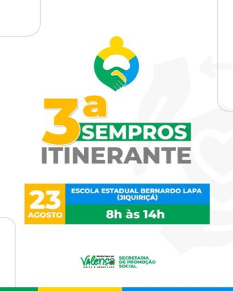 A comunidade do Jiquiriçá, em Valença, vai receber neste sábado (23) uma série de serviços gratuitos ofertados pela Prefeitura Municipal, através da Secretaria de Promoção Social. A ação acontece das 8h às 14h, no Colégio Bernardo Lapa, e integra a 3ª edição da SEMPROS Itinerante, programa que leva atendimentos diretos aos bairros e distritos do município.