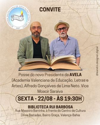 A AVELA realizará a solenidade de posse de sua nova diretoria no próximo 22 de agosto, às 19h30, na Biblioteca Municipal Ruy Barbosa, localizada ao lado do Centro de Cultura Olívia Barradas, em Valença-BA.
