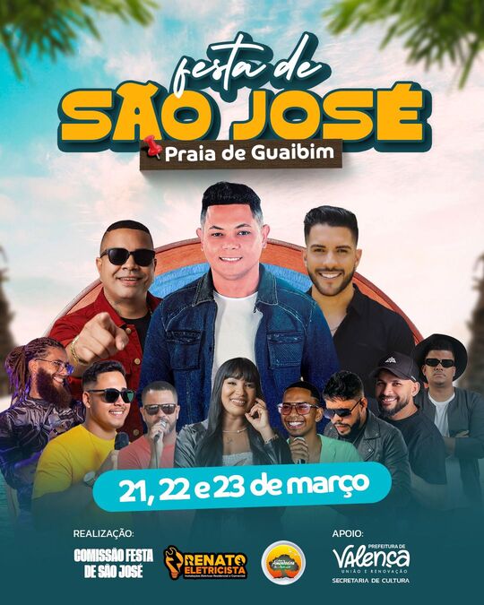 A programação musical da Festa de São José em Guaibim promete animar o público durante os três dias de celebração. Na sexta-feira (21), sobem ao palco Mendyolla, às 22h30, Fábio Márcio, à meia-noite, Di Sousa, às 2h30, além de Michel Vilar, encerrando a primeira noite. No sábado (22), a festa começa mais cedo, com DJ Ranger às 17h, seguido por Lívia Oliveira às 19h, Pablo Marques às 21h e Magno Neto às 23h30. Já no domingo (23), a animação continua com Banda Staccato ao meio-dia, Towinho, Amendoeira às 19h, Ney Araújo às 20h, Jaldo Rodrigues às 21h e, encerrando a programação, Fábio Márcio às 23h.