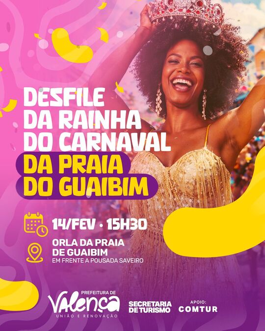 No próximo dia 14 de fevereiro, a partir das 15h30, a Orla da Praia de Guaibim será palco do Desfile da Rainha do Carnaval da Praia do Guaibim, reunindo beleza, alegria, música e muita energia positiva.