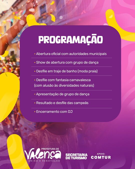 Promovido pela Prefeitura de Valença, por meio da Secretaria de Turismo, com apoio do Conselho Municipal de Turismo (COMTUR), o evento promete movimentar moradores e visitantes com uma programação especial. A abertura oficial conta com a presença de autoridades municipais, seguida por show com grupo de dança, desfile em traje de moda praia, desfile com fantasia carnavalesca em alusão às diversidades naturais, apresentações artísticas e o tão aguardado resultado com o desfile das campeãs. Para fechar em grande estilo, a animação fica por conta do DJ.