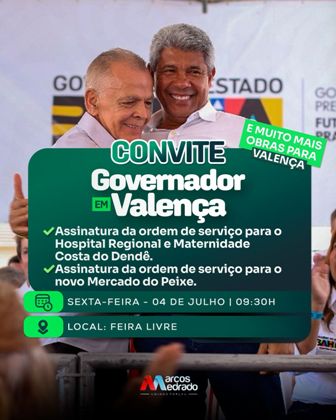O prefeito Marcos Medrado convida a população para participar deste ato, a partir das 09h, no largo da feira Livre de Valença, na Avenida Marita Almeida onde será assinada a Ordem de Serviço para o início da construção do Hospital Regional e Maternidade Costa do Dendê e a autorização para o início da obra da construção do novo Mercado de Peixe de Valença.