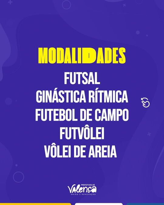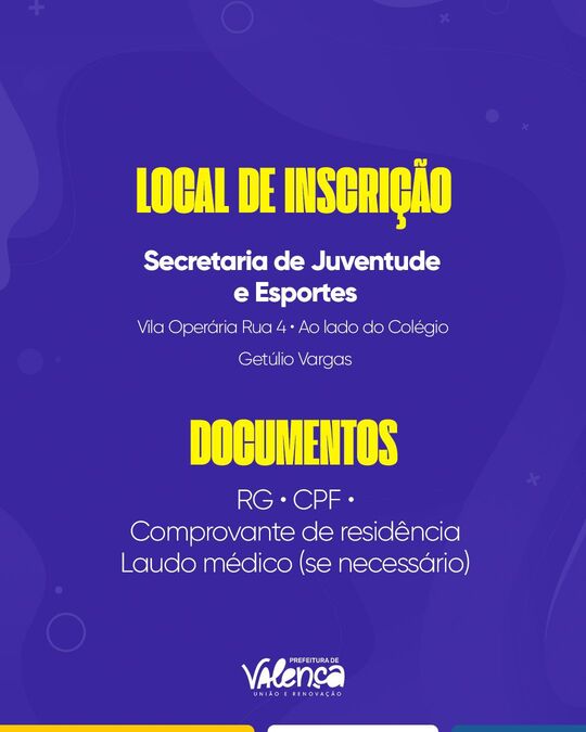 A Prefeitura de Valença, por meio da Secretaria de Juventude e Esportes, abre, de 26 a 30 de janeiro, as matrículas para as Escolinhas Esportivas Municipais, que oferecem modalidades gratuitas e incentivam o esporte como instrumento de inclusão social, qualidade de vida e disciplina.