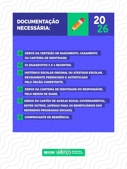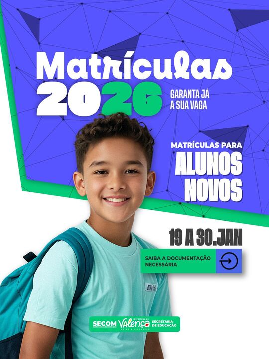 Começa nesta segunda-feira (19) o período de matrículas para alunos novos da rede municipal de ensino de Valença, referente ao ano letivo de 2026. O prazo segue até o dia 30 de janeiro, e a Prefeitura de Valença, por meio da Secretaria Municipal de Educação, orienta pais e responsáveis a ficarem atentos aos prazos e procedimentos para garantir a vaga dos estudantes.