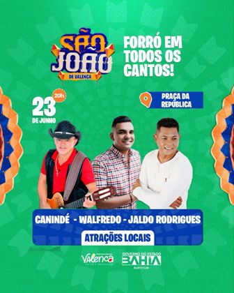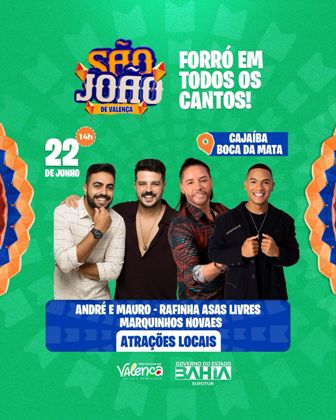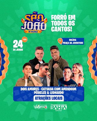 As atrações locais também vão brilhar e fazer a festa dos valencianos, mostrando todo o talento da nossa terra. Prepare o coração e afine o arrasta-pé, porque a Prefeitura está preparando uma celebração inesquecível para todos!