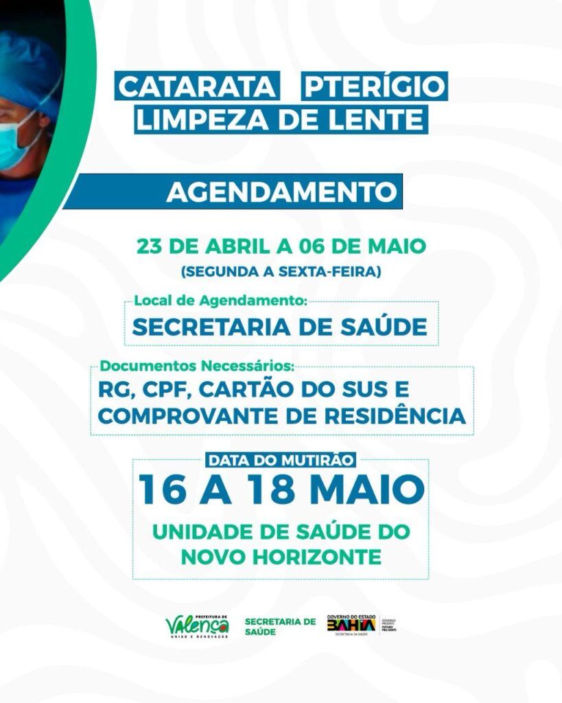 A Prefeitura de Valença, por meio da Secretaria Municipal de Saúde, em parceria com o Governo do Estado da Bahia, realizará um mutirão de cirurgias oftalmológicas entre os dias 16 e 18 de maio, na Unidade de Saúde do Novo Horizonte. O mutirão contemplará procedimentos para catarata, pterígio e limpeza de lente.