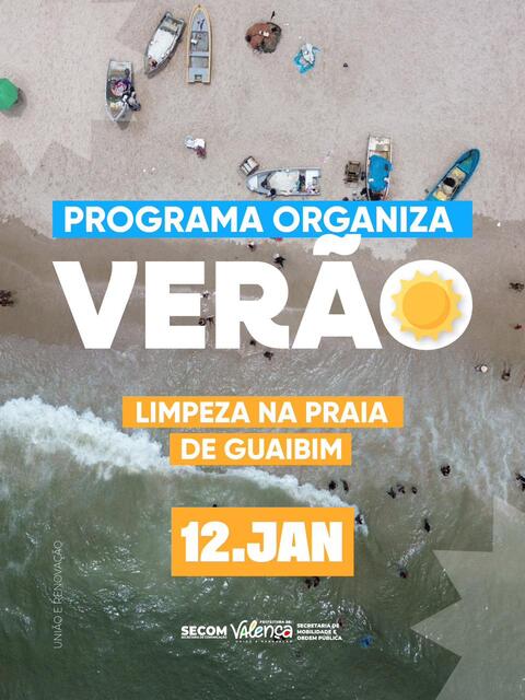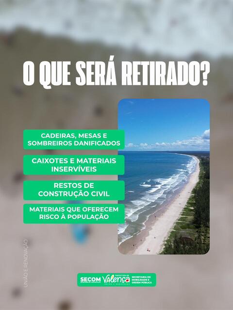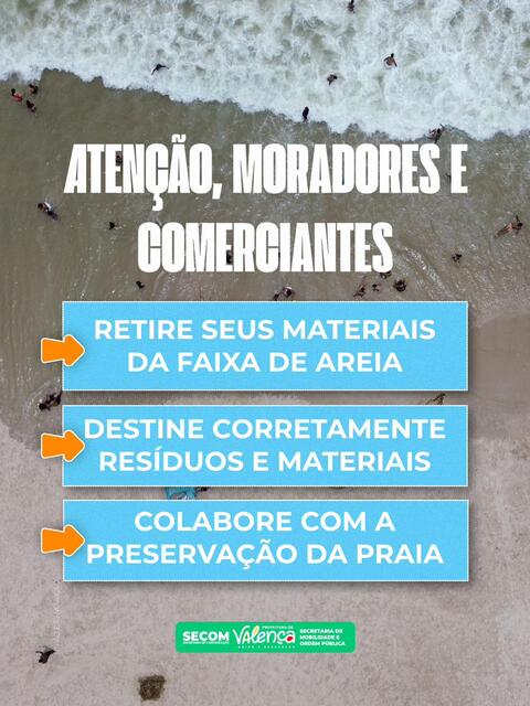 Dessa forma, a Prefeitura reforça a orientação aos proprietários desses materiais para que realizem a destinação correta em locais apropriados, contribuindo com o Projeto Organiza Verão que faz parte de conjunto de ações da gestão municipal voltadas ao ordenamento dos espaços públicos, à segurança dos frequentadores e à valorização do litoral valenciano, garantindo uma praia mais limpa, segura e acolhedora para todos.