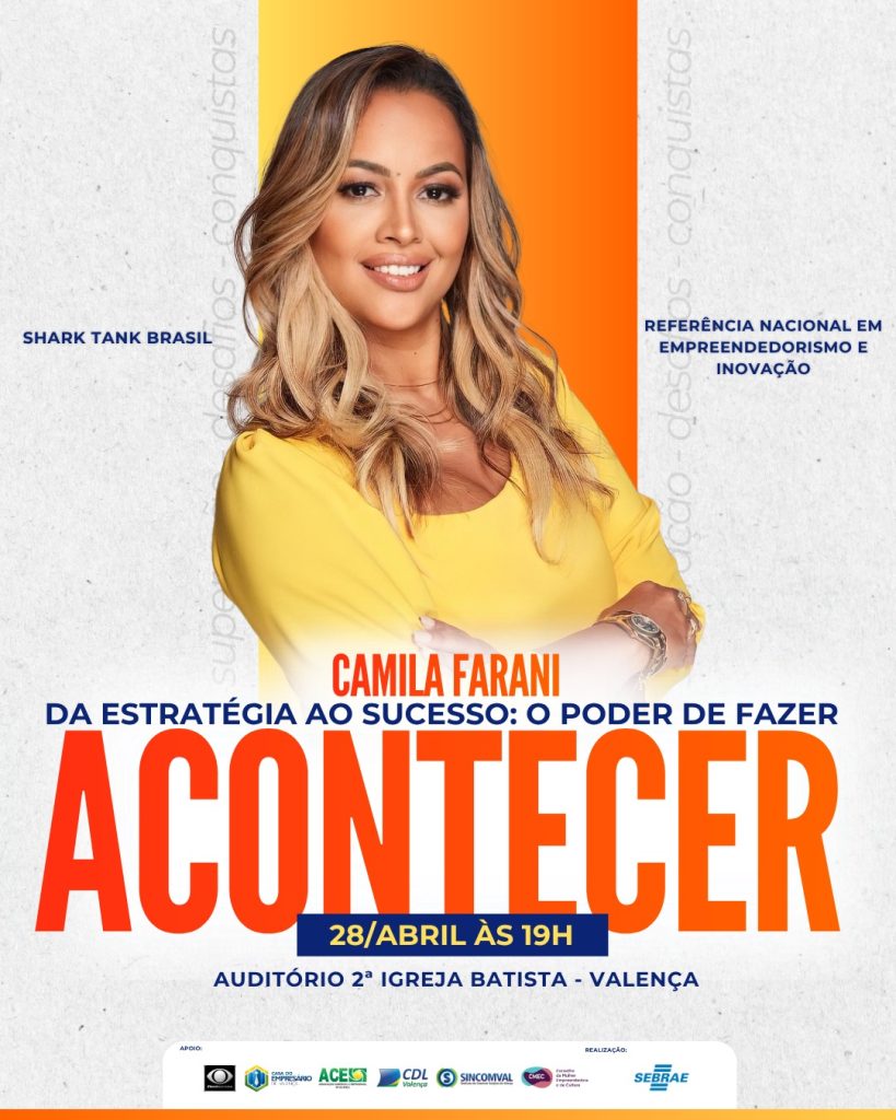 A investidora Camila Farani, conhecida nacionalmente por sua atuação no programa Shark Tank Brasil e por investimentos milionários em startups, estará na cidade no dia 28 de abril para ministrar uma palestra voltada ao desenvolvimento de negócios e crescimento profissional.