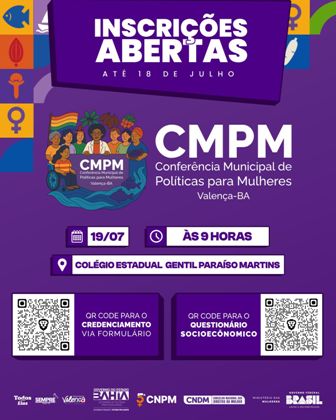 A Prefeitura de Valença, por meio da Secretaria de Políticas para as Mulheres e Reparação Social (SEMPRE), abriu as inscrições para a Conferência Municipal de Políticas para as Mulheres, que será realizada no sábado, 19 de julho, no Colégio Estadual Gentil Paraíso Martins, no bairro da Graça.