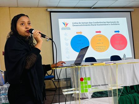 A bióloga Mônica Pereira, representante do Instituto Bioeducar e do Colegiado de Desenvolvimento Territorial (Codeter), conduziu a apresentação das etapas da conferência, que contou com grupos de trabalho divididos em cinco eixos temáticos e três eixos transversais, todos voltados para a melhoria da qualidade de vida do homem e da mulher do campo.