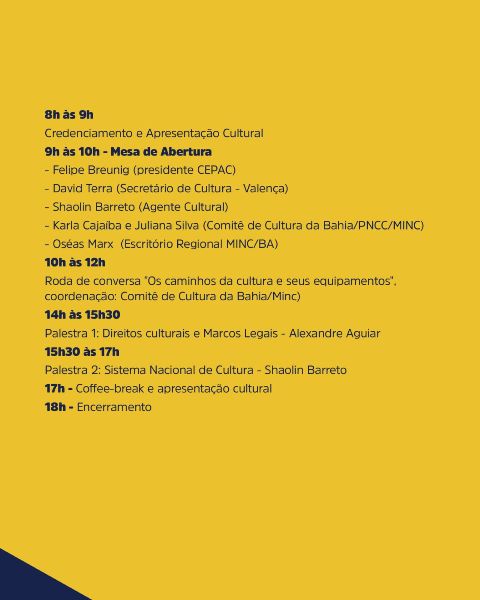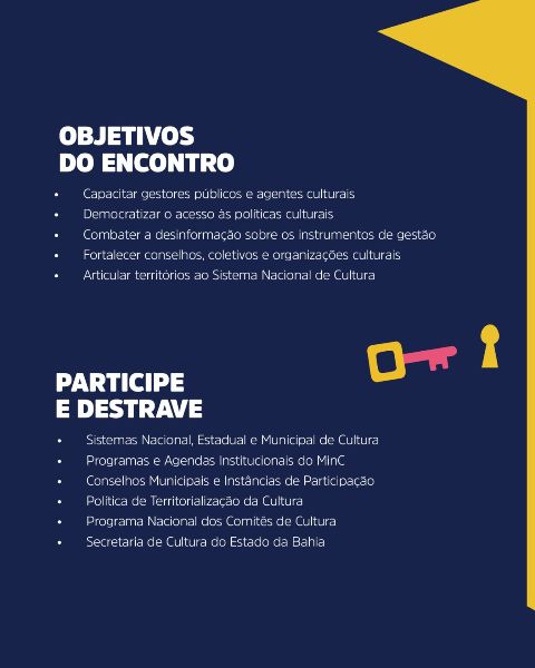 A iniciativa convida gestores e agentes a participarem e destravarem ações voltadas ao fortalecimento dos Sistemas Nacional, Estadual e Municipal de Cultura, bem como dos Programas e Agendas Institucionais do Ministério da Cultura (MinC), dos Conselhos Municipais e demais instâncias de participação. O evento também aborda a Política de Territorialização da Cultura, o Programa Nacional dos Comitês de Cultura e as ações da Secretaria de Cultura do Estado da Bahia.